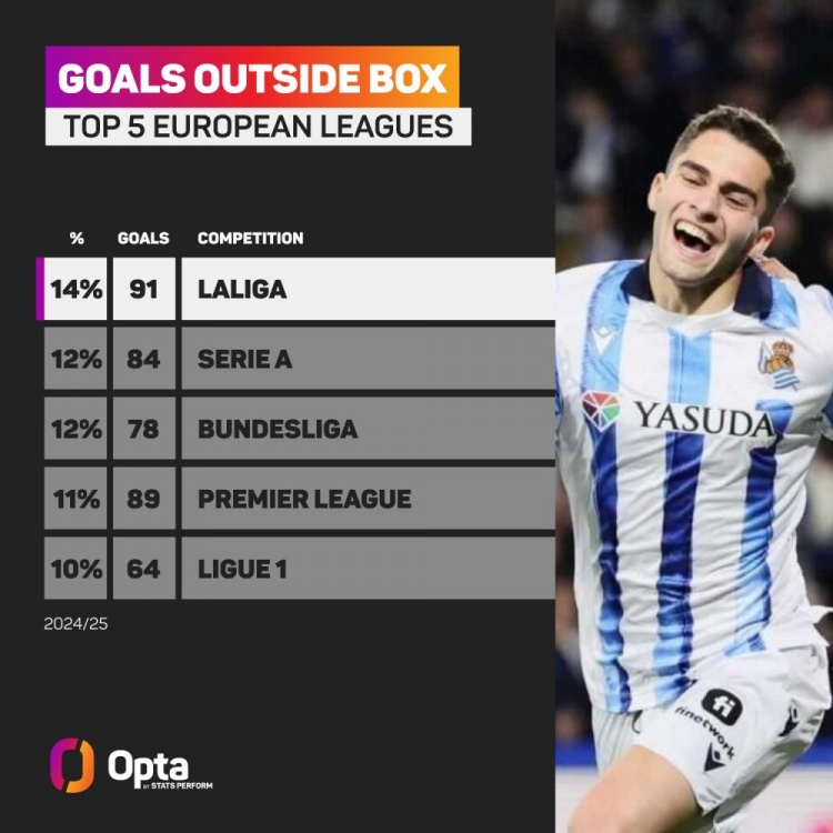 2025-02-24 15:04:27西甲本賽季禁區外進球占比14%,該項數據五大聯賽最高