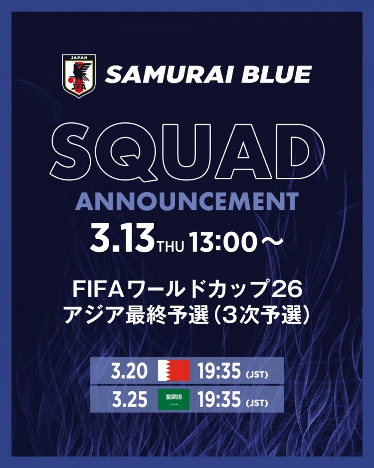 日本隊(duì)這兩場世預(yù)賽的名單將在當(dāng)?shù)貢r(shí)間3月13日13:00(北京時(shí)間13日12:00)公布。目前在18強(qiáng)賽C組,日本隊(duì)5勝1平積16分傲居榜首。