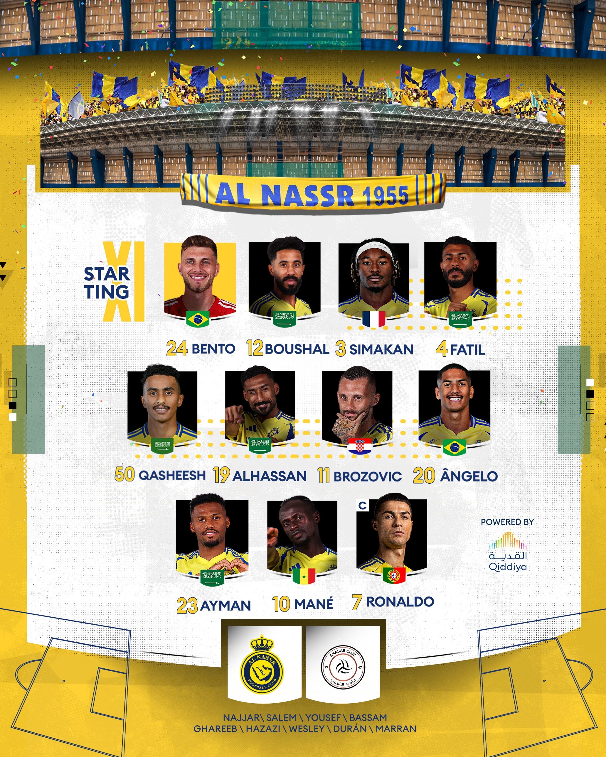 利雅得勝利首發:24-本托、12-納瓦夫、3-西馬坎、4-法蒂爾、50-卡謝什、19-哈桑、11-布羅佐維奇、20-安吉洛、23-葉海亞、10-馬內、7-C羅