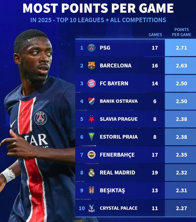 2025-03-08 02:21:202025年各項賽事場均拿分榜:巴黎巴薩拜仁前三,皇馬費內巴切在列