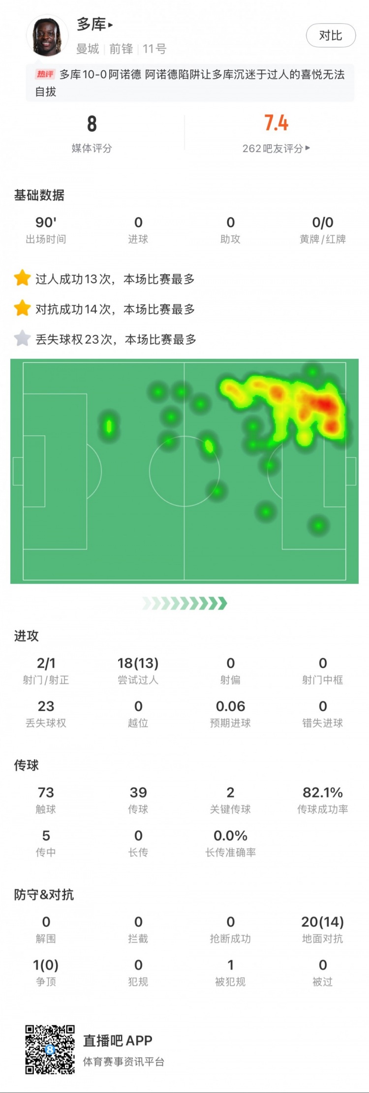 2025-02-24 15:05:08多庫本場數據:13次成功過人,14次贏得對抗,23次丟失球權均最多