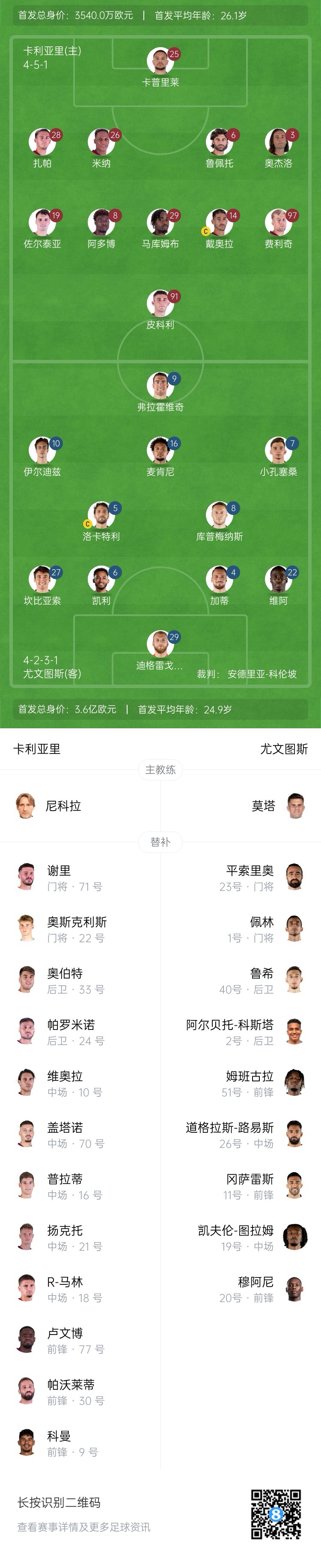 2月24日訊 意甲第26輪,卡利亞里主場迎戰尤文比賽即將打響。賽前首發出爐。