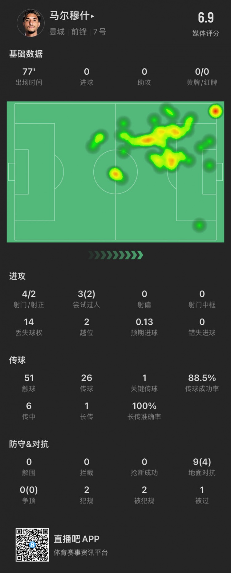 傳球數(shù)據(jù):51次觸球,26次傳球,傳球成功率88.5%