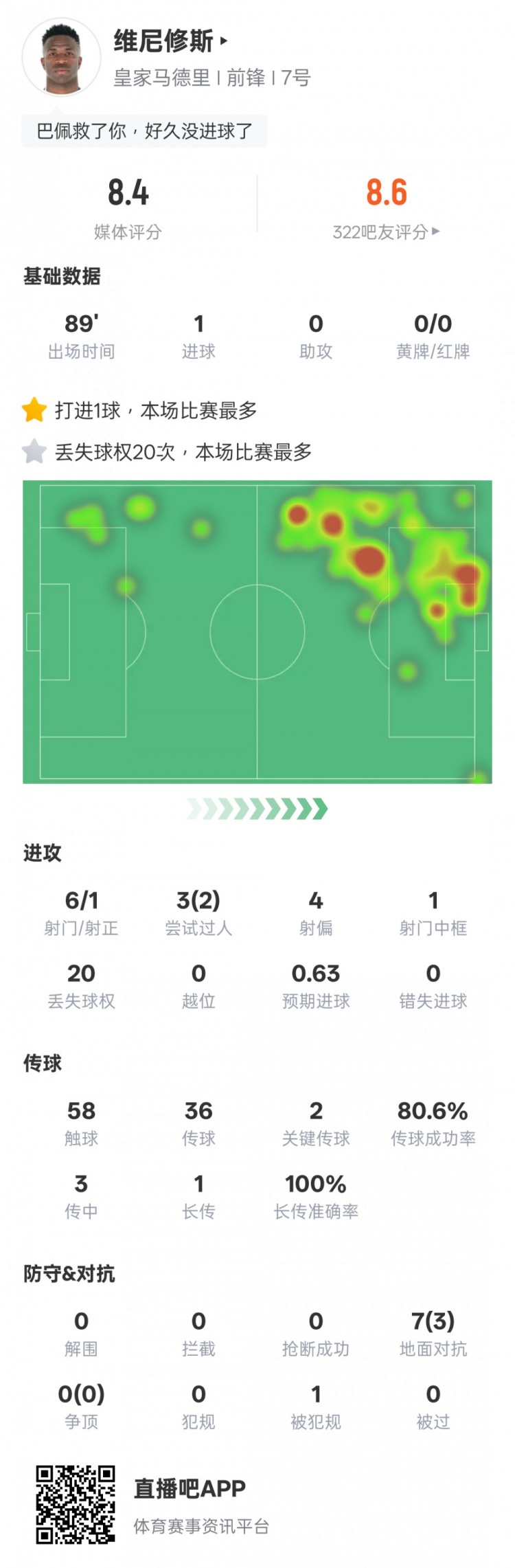 維尼修斯本場(chǎng)比賽數(shù)據(jù)如下:
