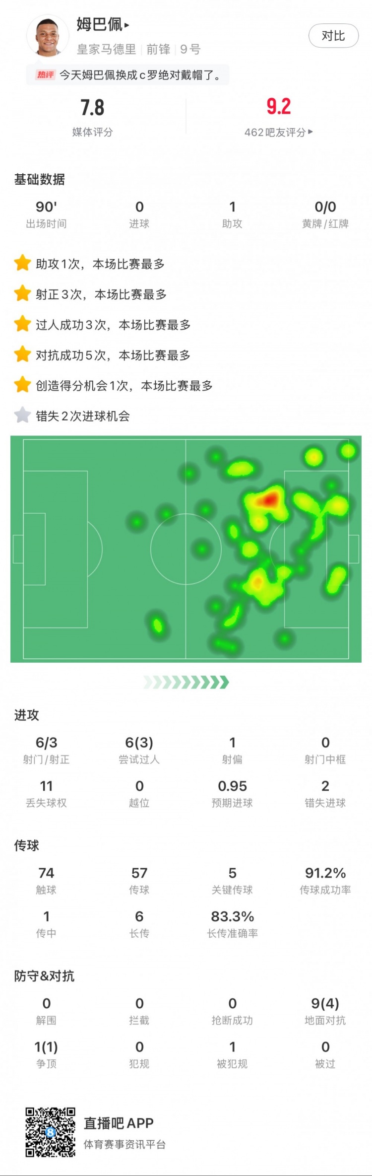 2025-02-24 15:05:34姆巴佩本場數據:1次助攻,6射3正,2次錯失得分機會,3次過人